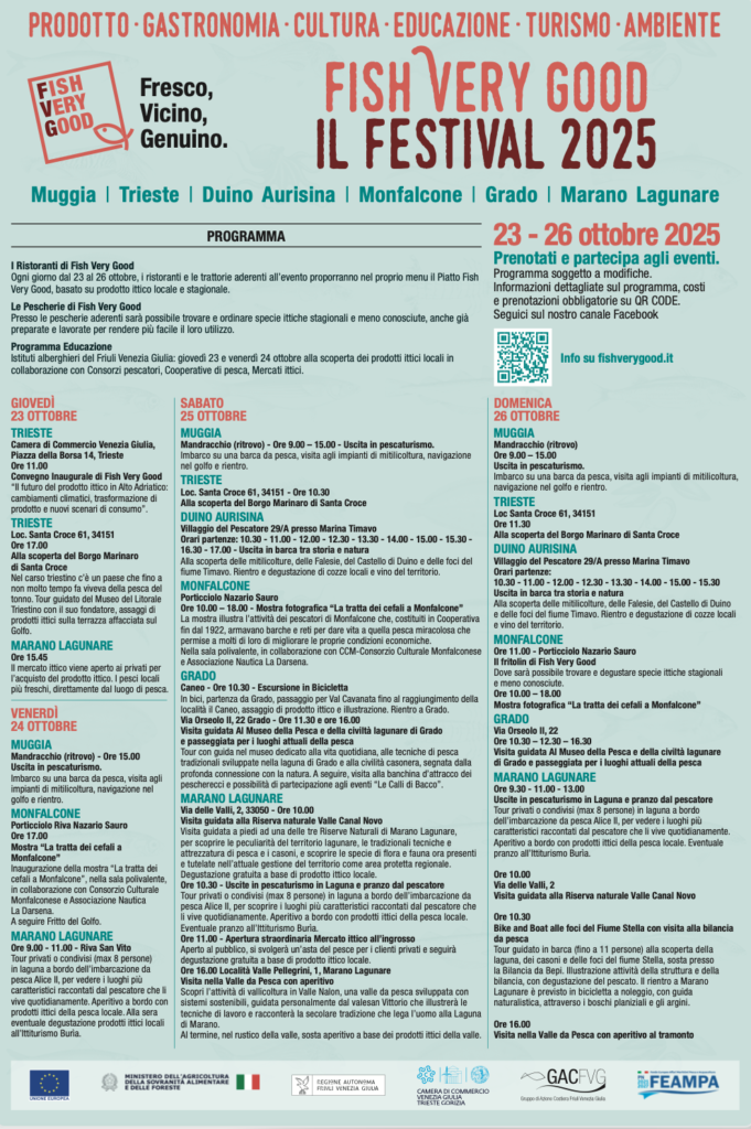 L’edizione 2025 mira a essere un contenitore di visibilità per tutte le attività legate alla pesca e all’acquacoltura nella regione. Per la prima (ri)edizione, il festival si svolgerà in modo diffuso e autentico, toccando diverse località e marinerie del Friuli Venezia Giulia5.