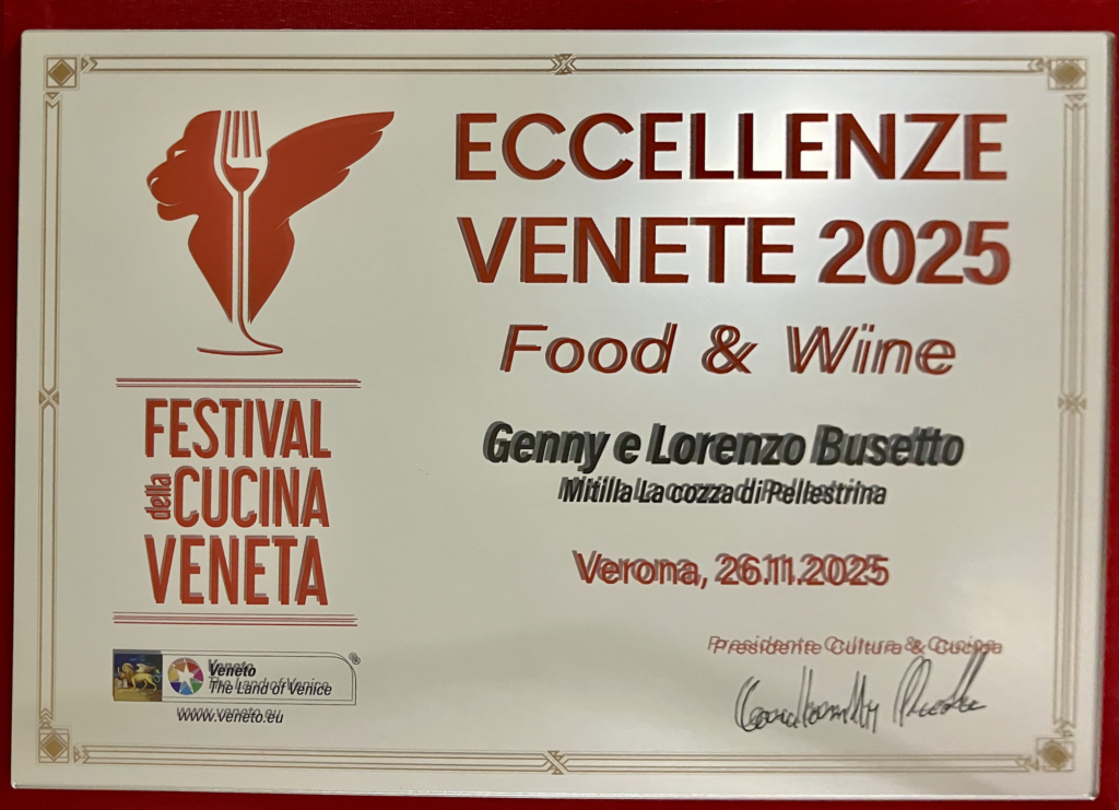 Il 25 Novembre 2025 Mitilla è stata premiata tra le Eccellenze Venete, un riconoscimento conferito a imprese, artigiani e realtà del territorio che si distinguono per innovazione, sostenibilità e valorizzazione delle radici locali. Il premio celebra il contributo di chi, come Mitilla, porta avanti con visione e dedizione il patrimonio della laguna veneta, trasformandolo in un modello di sviluppo responsabile. Un riconoscimento al legame con Pellestrina, alla qualità del prodotto e all’impegno concreto per un’acquacoltura più sostenibile e consapevole.